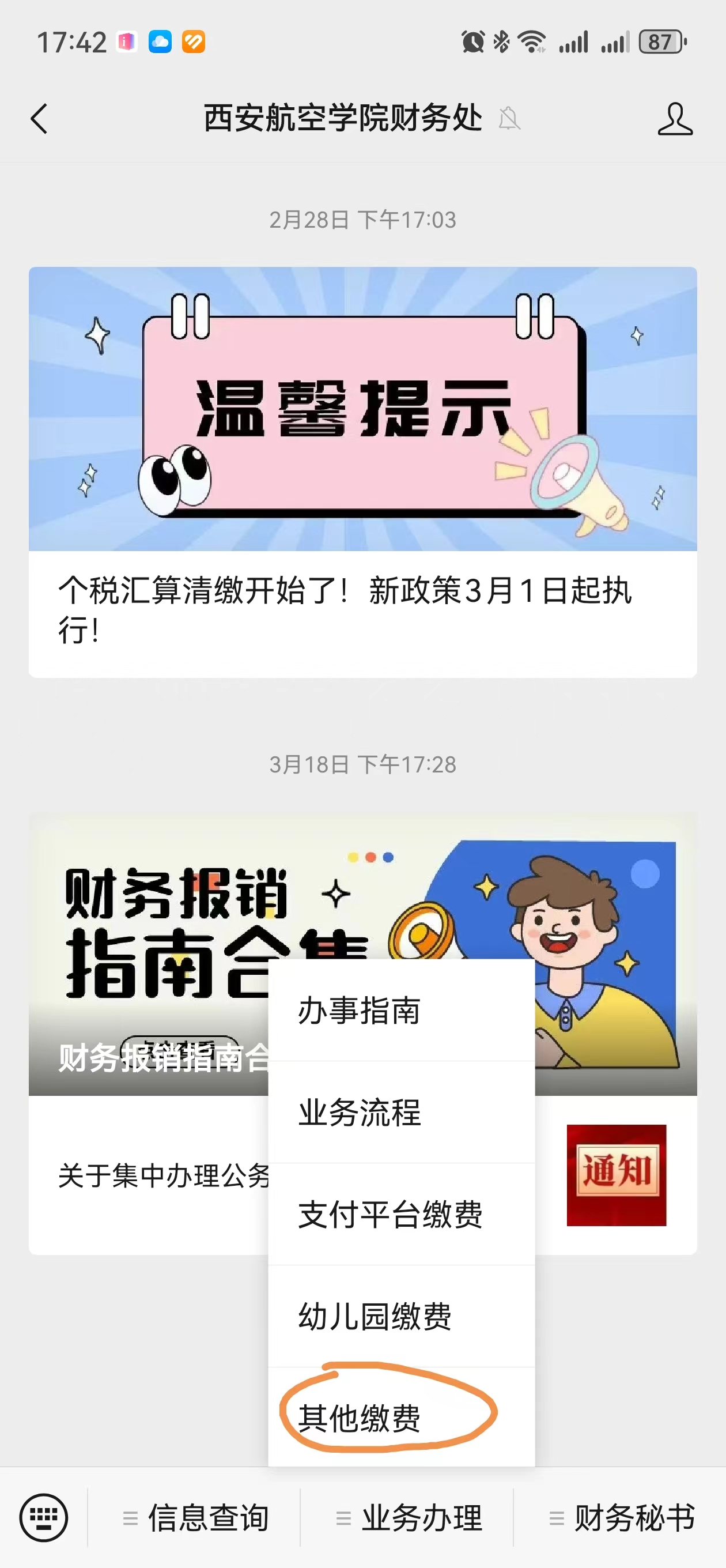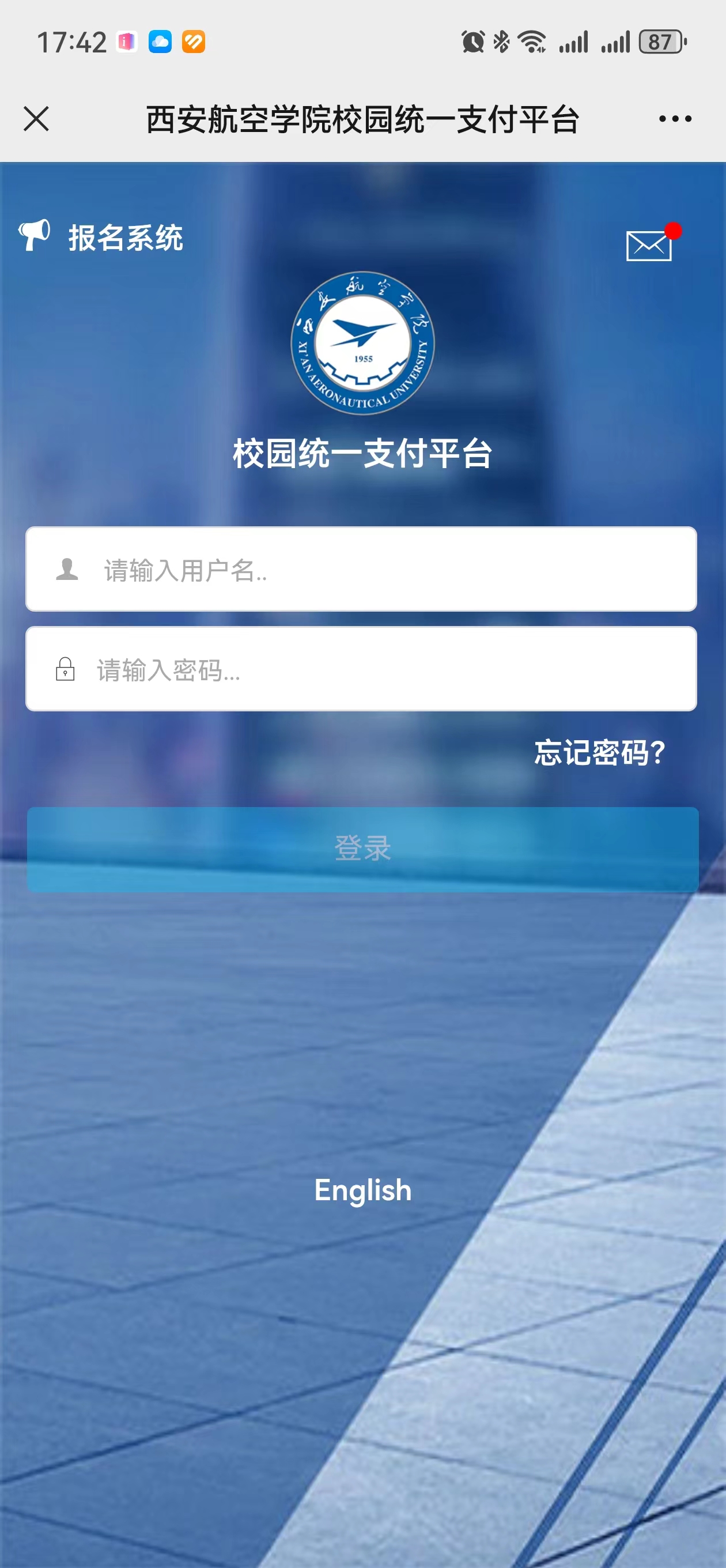 关注后点击“业务办理”、“其他缴费”,进入565net必赢客户端“校园统一支付平台”,输入账号、密码进行登录。