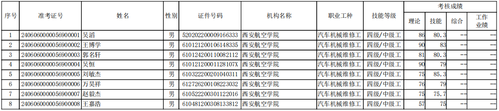 2024年上半年汽车机械维修工职业技能等级认定成绩公示